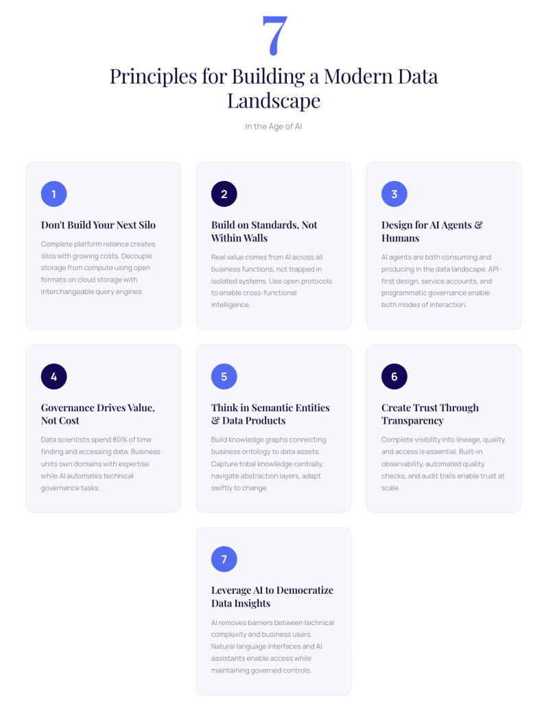 To move from a bottlenecked, manual, and siloed system to an adaptive, AI-augmented architecture requires a shift in perspective. The following are seven principles I use when considering choices in building out a data landscape — principles that move beyond simply integrating tools and address the foundation of data strategy.