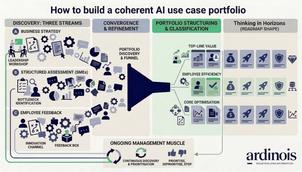 One thing that distinguishes mature AI programmes from early-stage ones is that use case discovery and portfolio management become ongoing rather than periodic. The three streams described above do not produce a definitive list — they feed a funnel that evolves as the organisation learns, as the technology develops, and as business priorities shift.